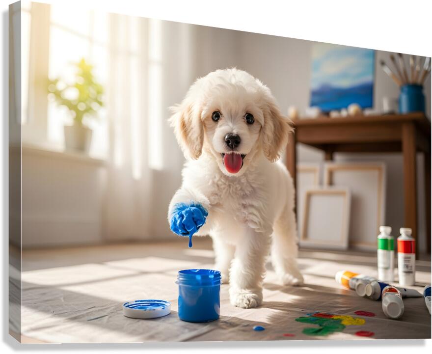 Poodle Puppy Discovers Colorful Paint Containers Canvas print