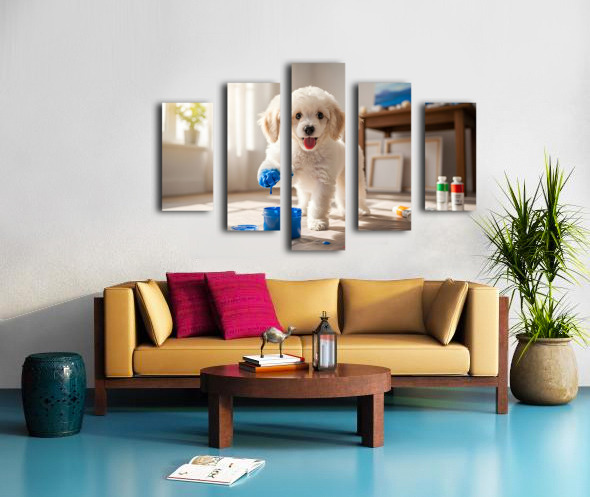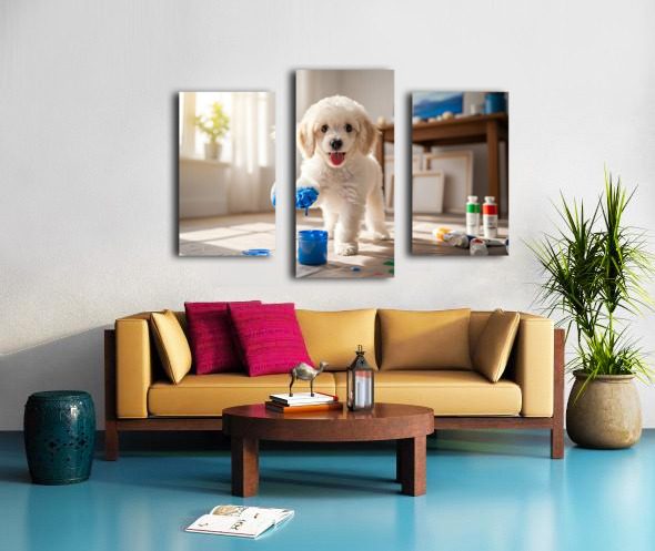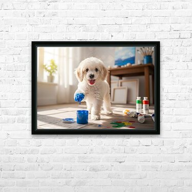 Poodle Puppy Discovers Colorful Paint Containers Picture Frame Printing