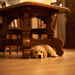 A golden retriever puppy cautiously peeks out from behind a tall wooden bookshelf with one bright amber eye and part of its golden face visible as it checks if the coast is clear during the game. Digital Artwork.