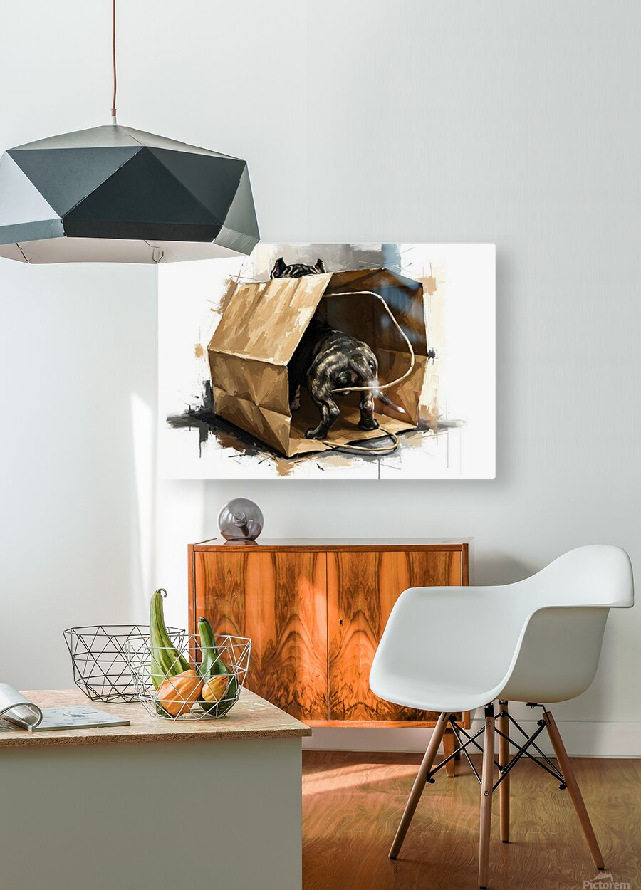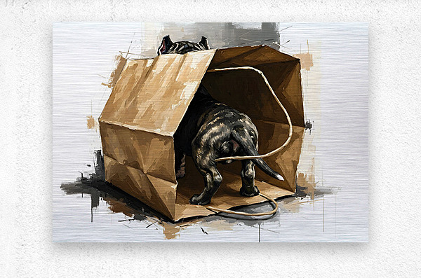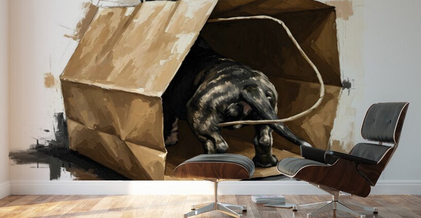 The dark brindle Cane Corso puppy is backing out of the brown paper shopping bag with a joyful expression tongue slightly visible and eyes bright with excitement. The wooden floor frames this moment of discovery. Digital Artwork.