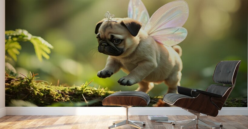 An adorable tan pug puppy wearing shimmering fairy wings and a sparkly silver headband stands in an enchanted garden setting. Purple and pink flowers ...[+]