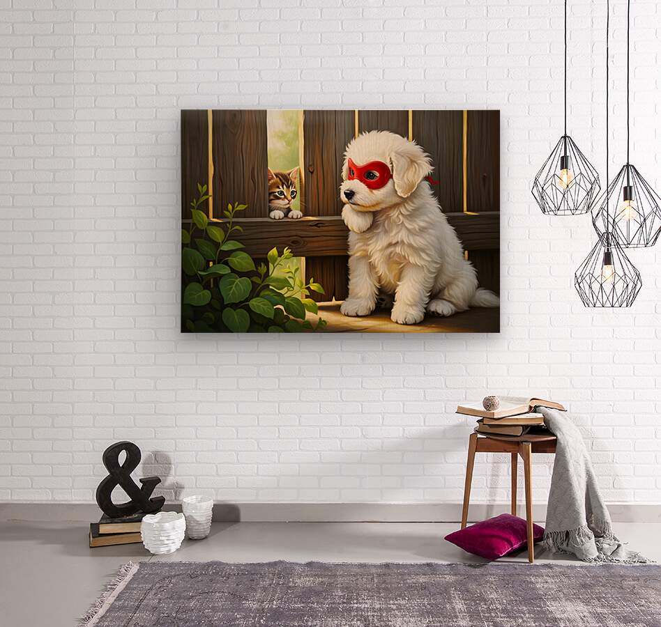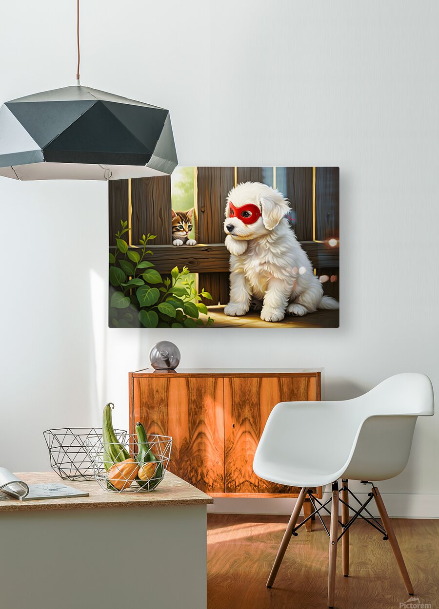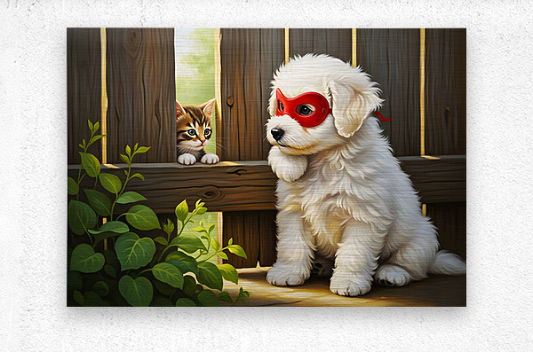 The victorious white Bichon Frise puppy stands proudly beside the rescued kitten in an open meadow. Both animals appear happy and safe with the masked puppys chest puffed out in triumph as wildflowers blur beautifully in the foreground. Digital Artwork.
