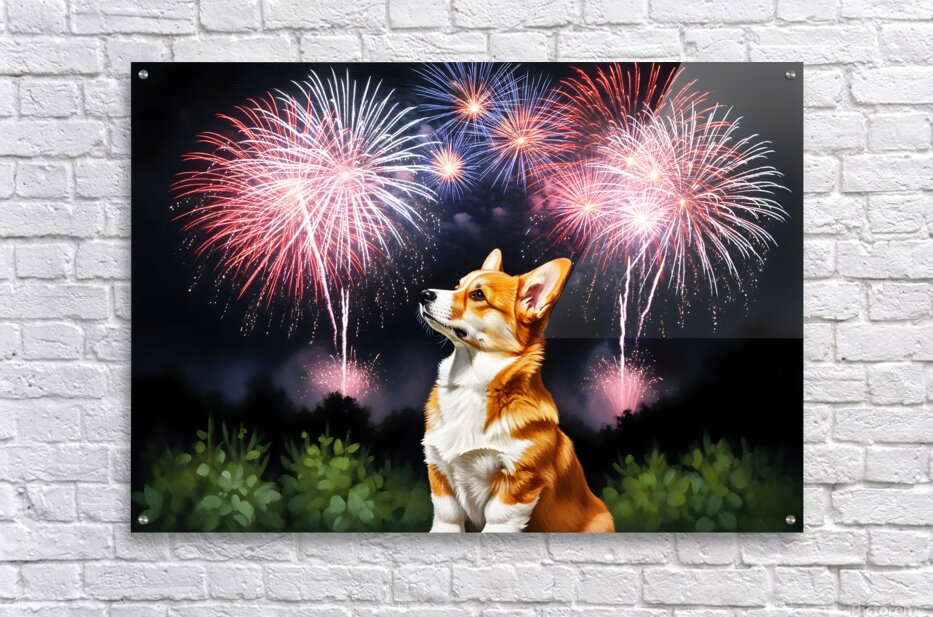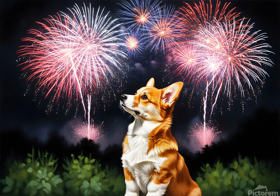 ABOUT THIS ARTWORK: HAPPY CORGI PUPPY WAGS TAIL AFTER FIREWORKS END