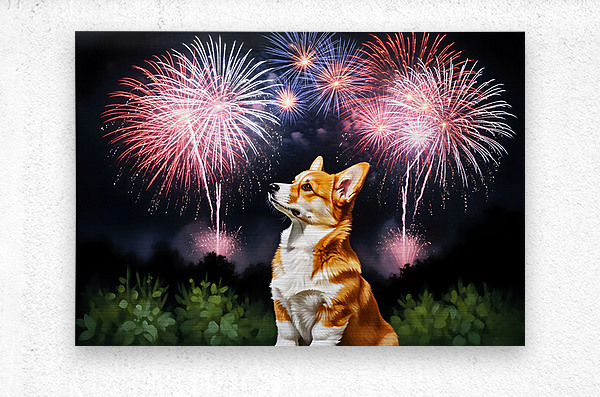 The confident Pembroke Welsh Corgi puppy with orange and white coat stands proudly with tail wagging as wisps of smoke drift across the peaceful night sky after the fireworks display has ended Digital Artwork.