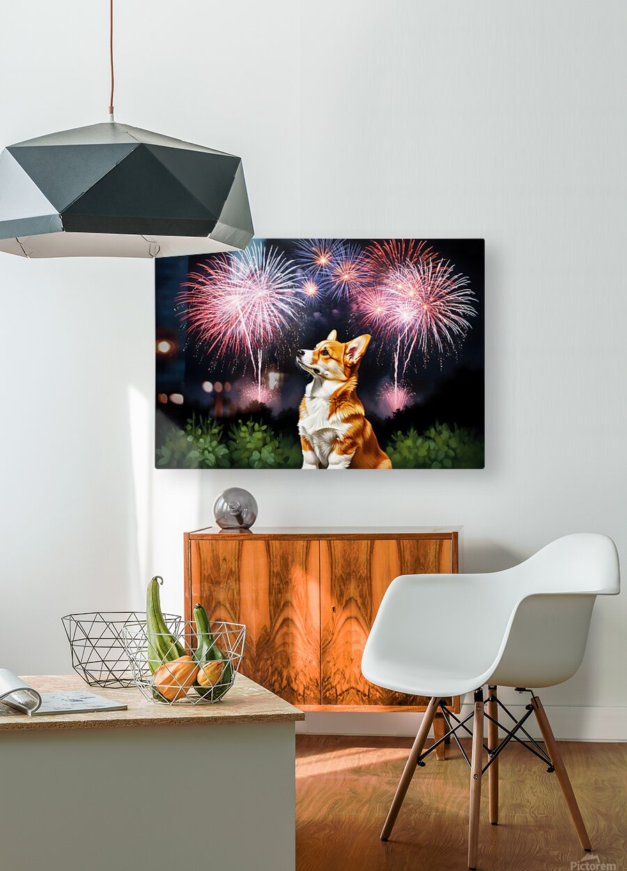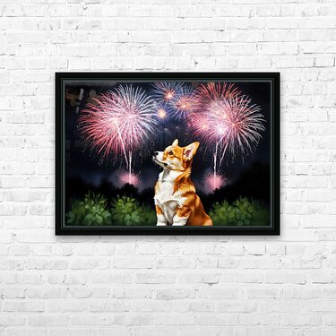 Get this artwork "Happy Corgi Puppy Wags Tail After Fireworks End" in a framed print.