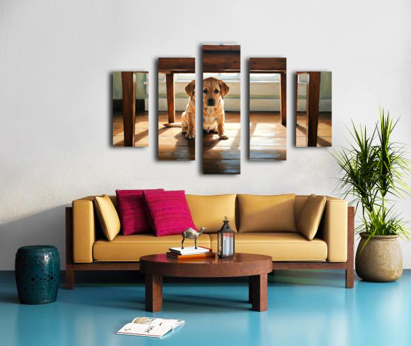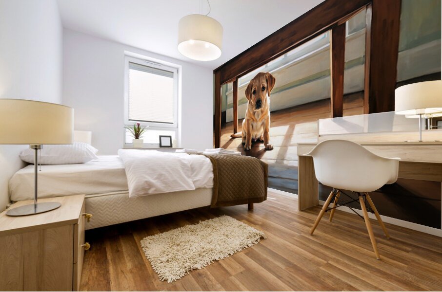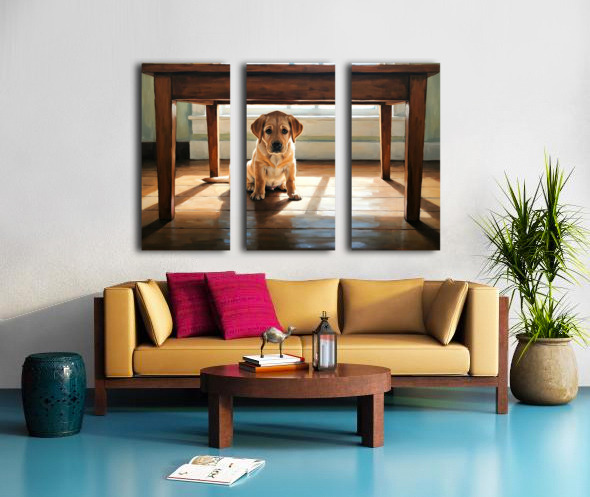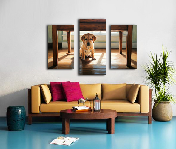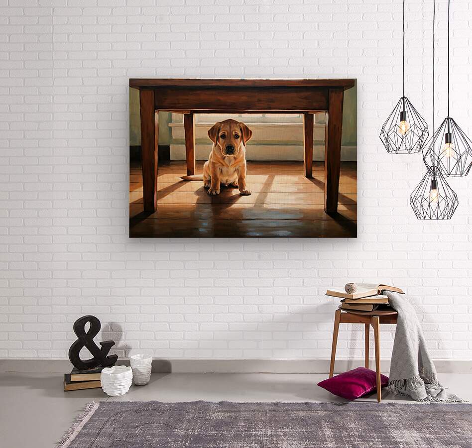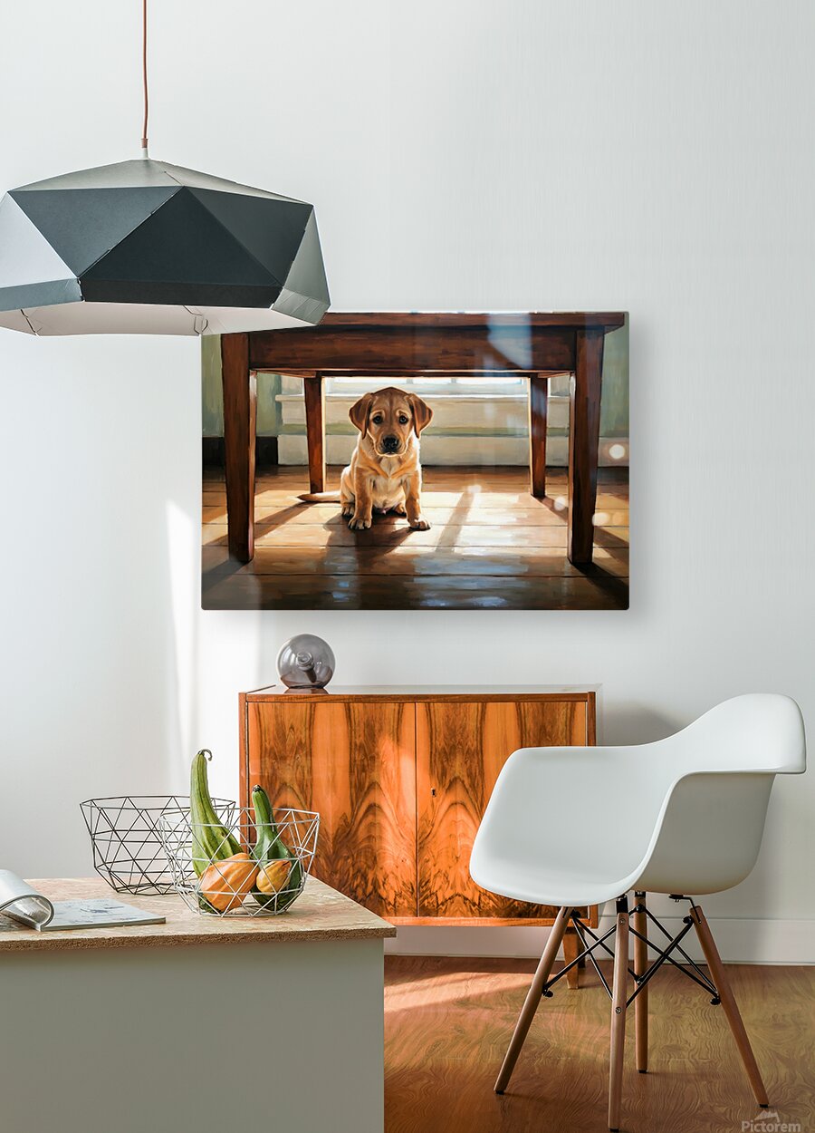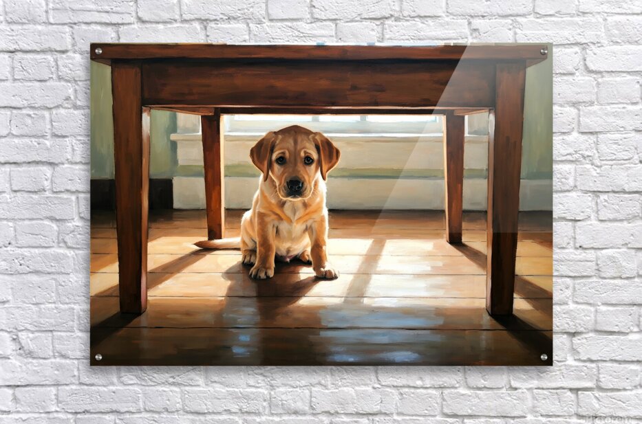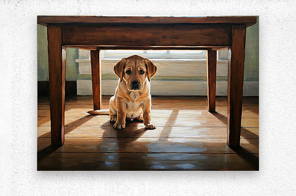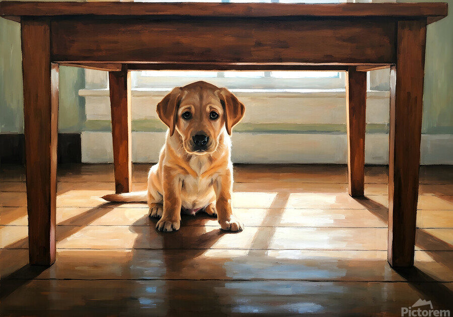The golden Labrador puppy cautiously steps out from under the wooden table with front paws on the floor. The puppys tail shows a small wag and brighter lighting suggests the storm has passed. Digital Artwork.