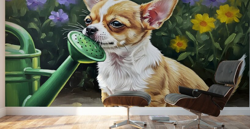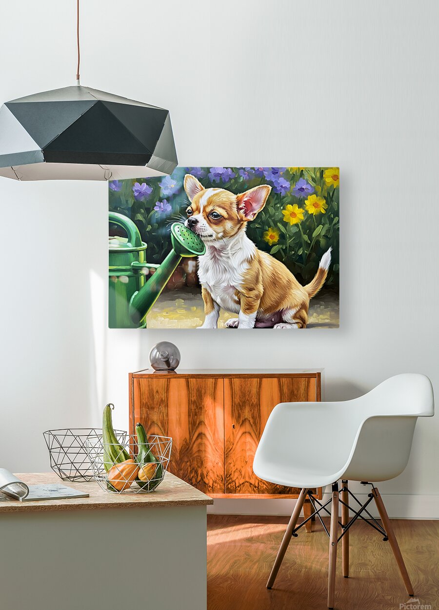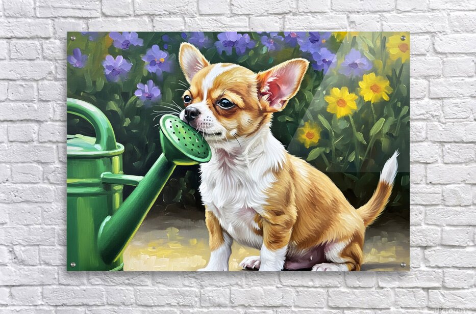 Get this artwork "Chihuahua Puppy Discovers Garden Watering Can" in a framed print.