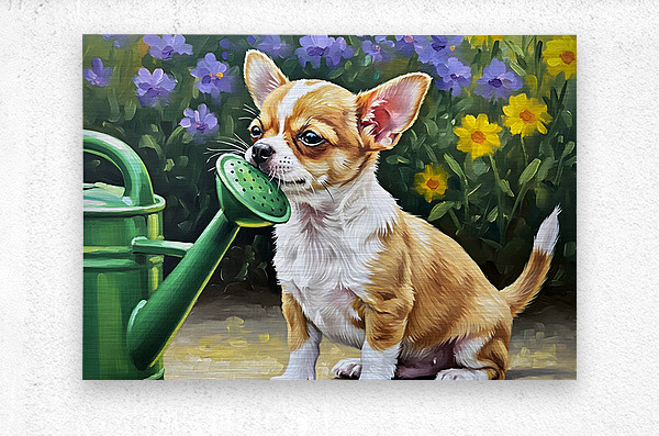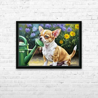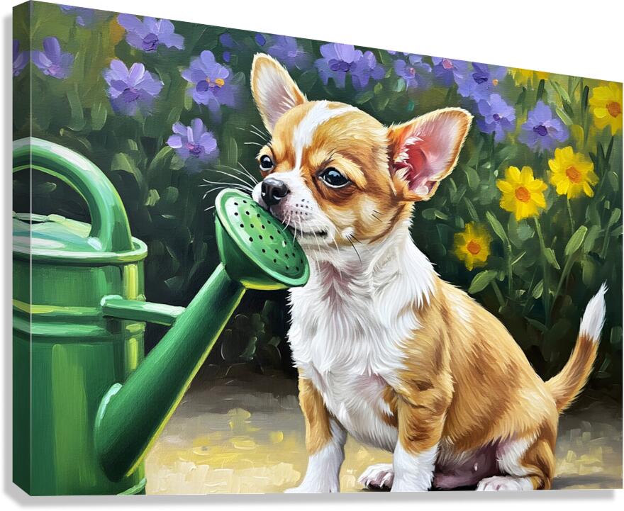 Get this artwork "Chihuahua Puppy Discovers Garden Watering Can" in a framed print.