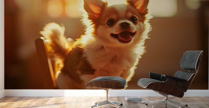 A tiny tan and white Chihuahua puppy sits proudly on a child-sized wooden rocking chair decorated with painted flowers. The puppys large dark eyes sparkle with curiosity as its small paws rest on the armrests. Digital Artwork.