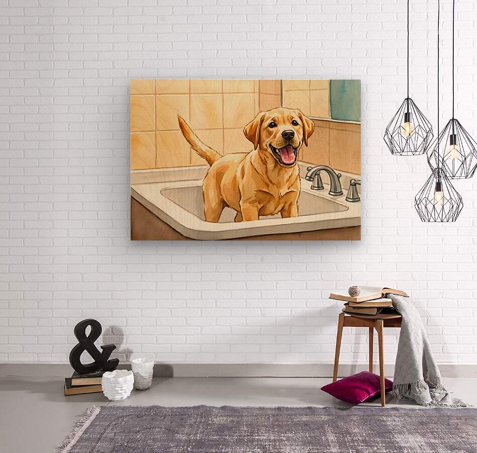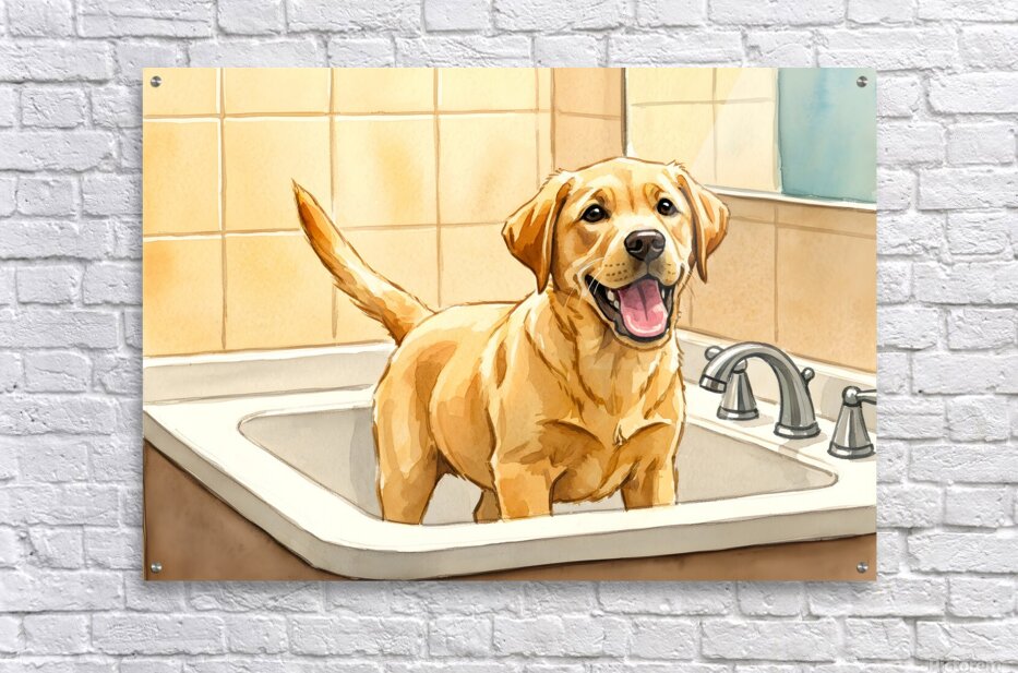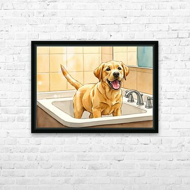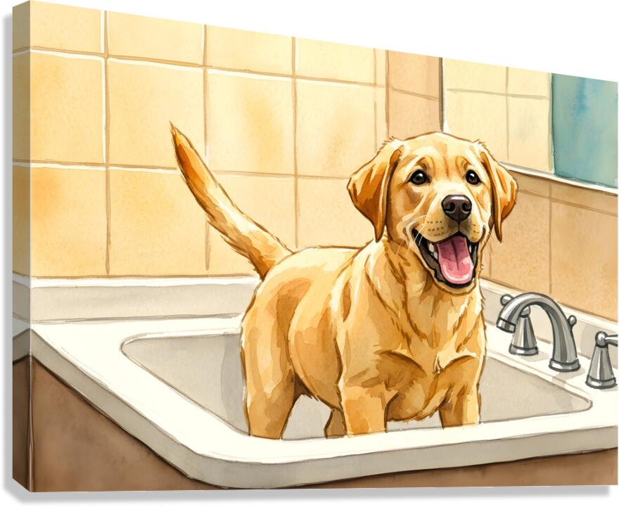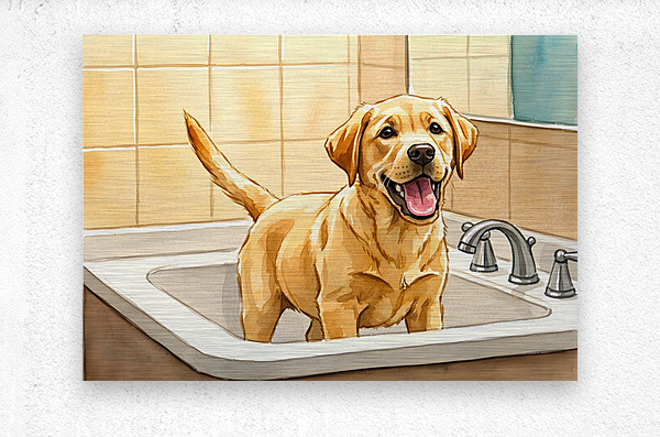 The golden Labrador puppy sits patiently in the sink with a calm trusting expression his posture relaxed and ready as he accepts that bath time is about to begin Digital Artwork.