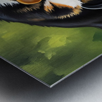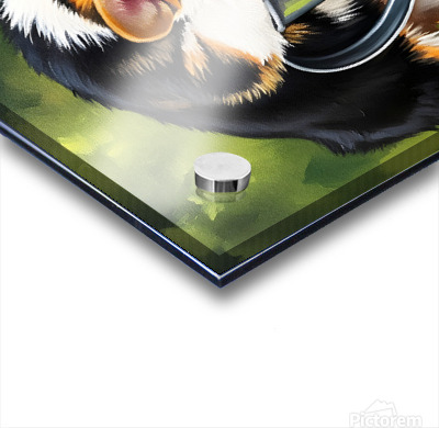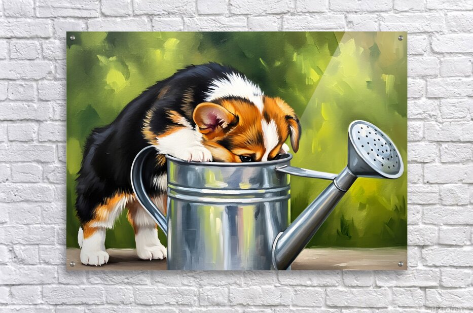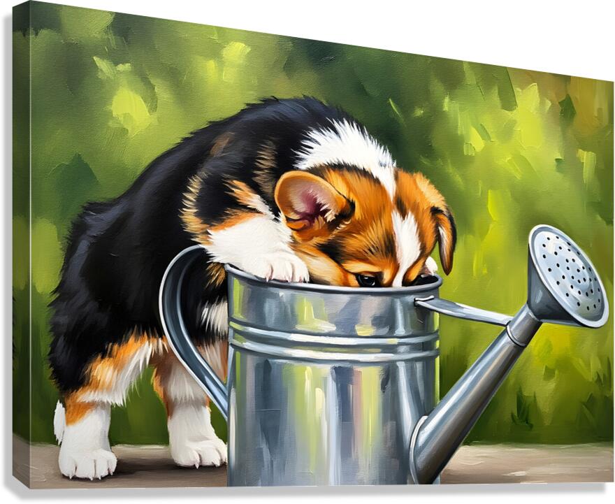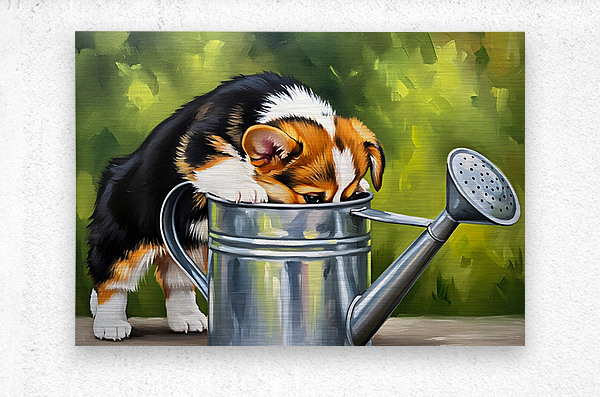 A happy tri-colored Pembroke Welsh Corgi puppy withdraws from a metal watering can with a thoroughly wet face. Water droplets cling to the puppys orange white and black fur as it appears satisfied with its drinking adventure. Digital Artwork.