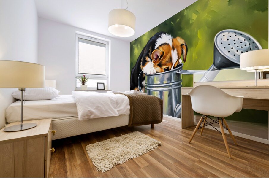 ABOUT THIS ARTWORK: WET CORGI PUPPY EMERGES FROM WATERING CAN ADVENTURE