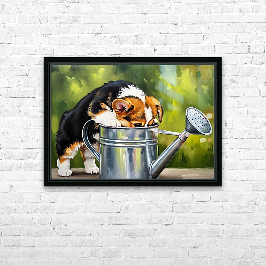 Get this artwork "Wet Corgi Puppy Emerges From Watering Can Adventure" in a framed print.