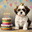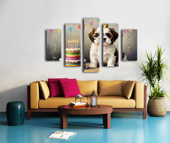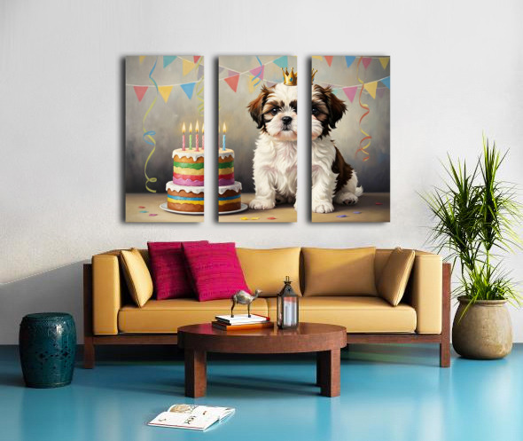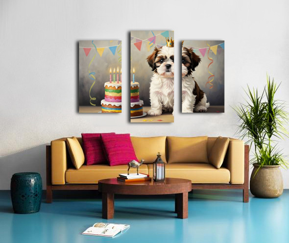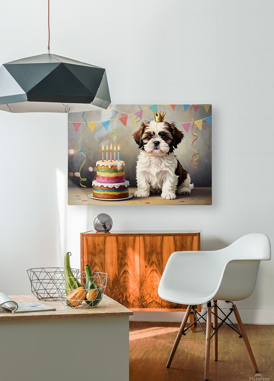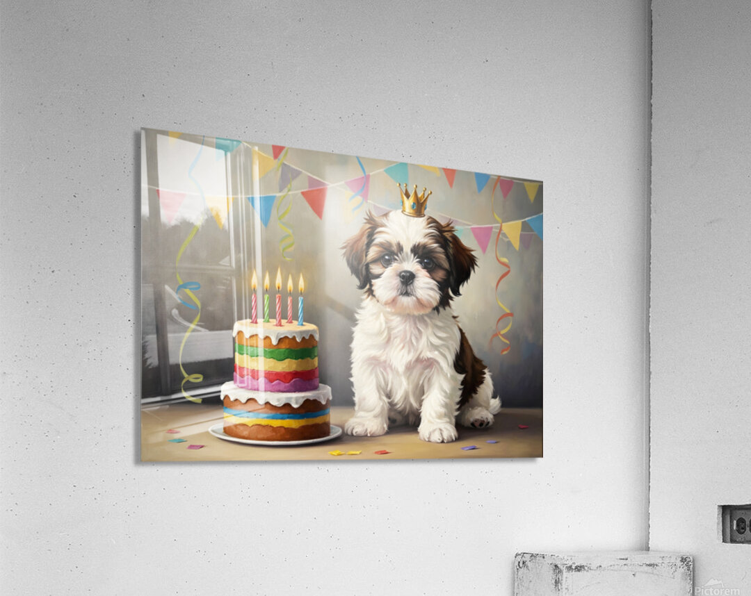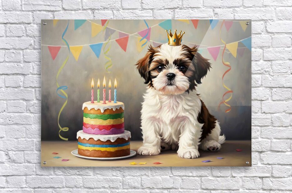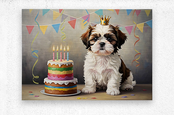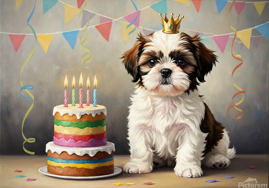 A content Shih Tzu puppy with fluffy white and brown fur rests on a comfortable cushion tiny golden crown askew on its head. Scattered wrapping paper and party remnants surround the drowsy birthday celebrant. Digital Artwork.