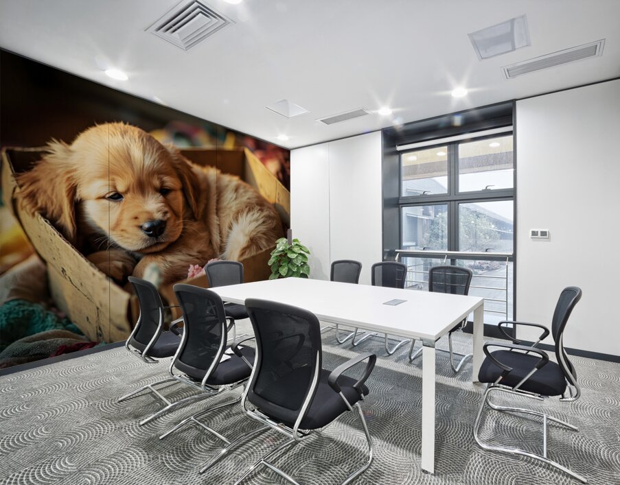 An energetic golden retriever puppy with bright golden fur peeks out from a cardboard box opening front paws positioned on the edge. The playful puppy appears ready to venture out from the cozy hideaway. Digital Artwork.