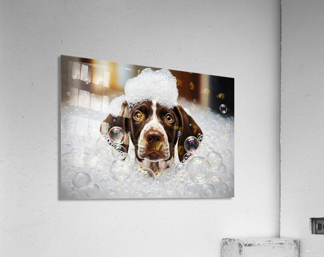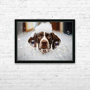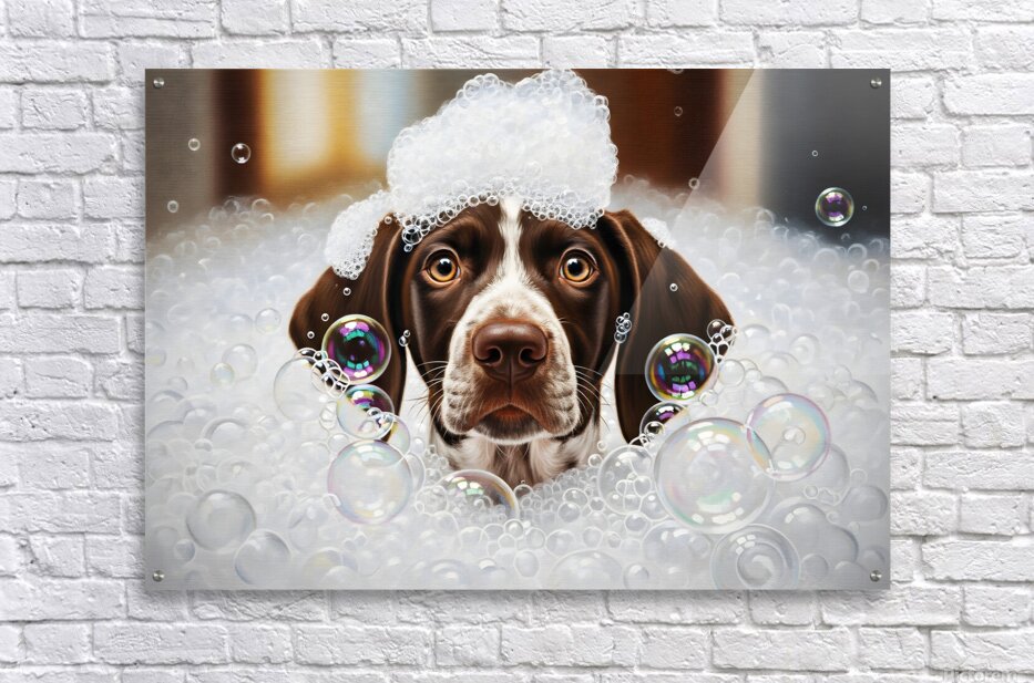 Get this artwork "German Shorthaired Pointer Puppy Shakes Off The Bubbles" in a framed print.