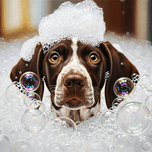 A wet German Shorthaired Pointer puppy vigorously shakes his brown and white coat sending soap bubbles and water droplets flying in all directions. His fur is spiky from the water and his expression shows pure happiness from his bubble adventure. Digital Artwork.