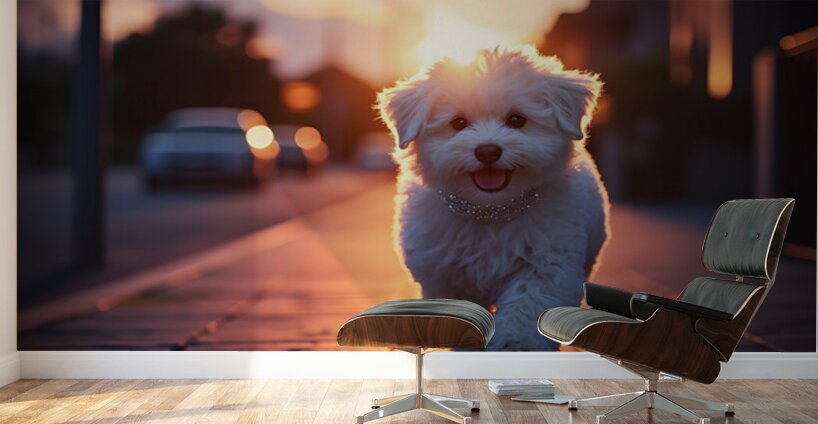 An adorable white Bichon Frise puppy sits eagerly indoors wearing a beautiful sparkly silver collar that catches the light. The fluffy puppy looks excited and ready for an adventure with cozy home elements softly blurred behind. Digital Artwork.