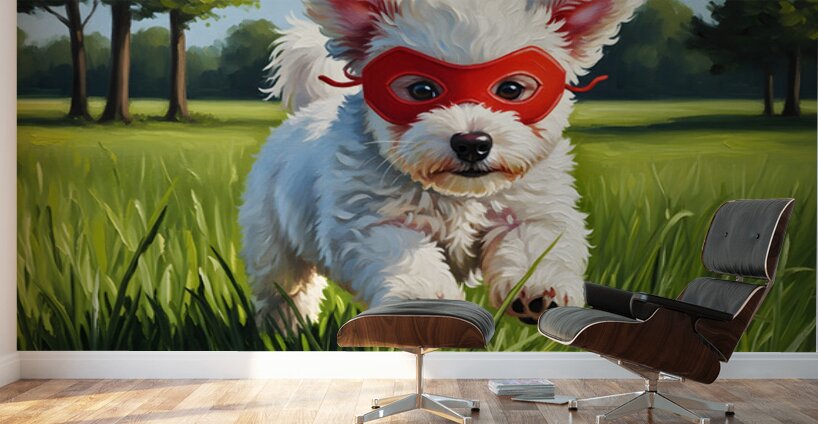 A fluffy white Bichon Frise puppy wearing a vibrant red superhero mask stands confidently in a bright garden setting. The small dogs tail is wagging with pure excitement as colorful blurred flowers create a dreamy foreground. Digital Artwork.