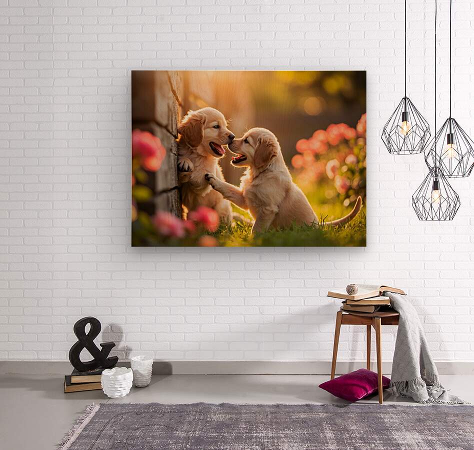 A content golden retriever puppy sits peacefully beside the wooden fence golden fur gleaming with happiness tail wagging as it enjoys the friendship formed through the garden barrier Digital Artwork.