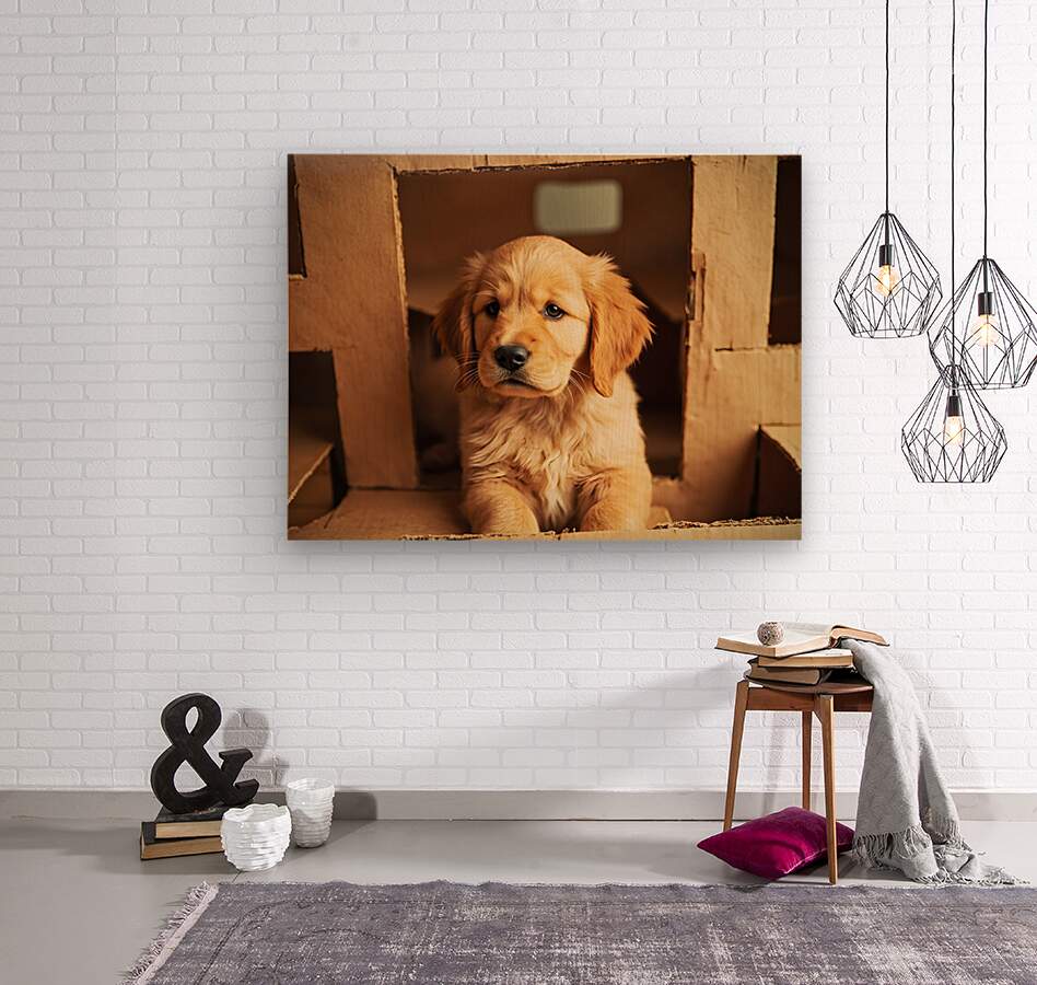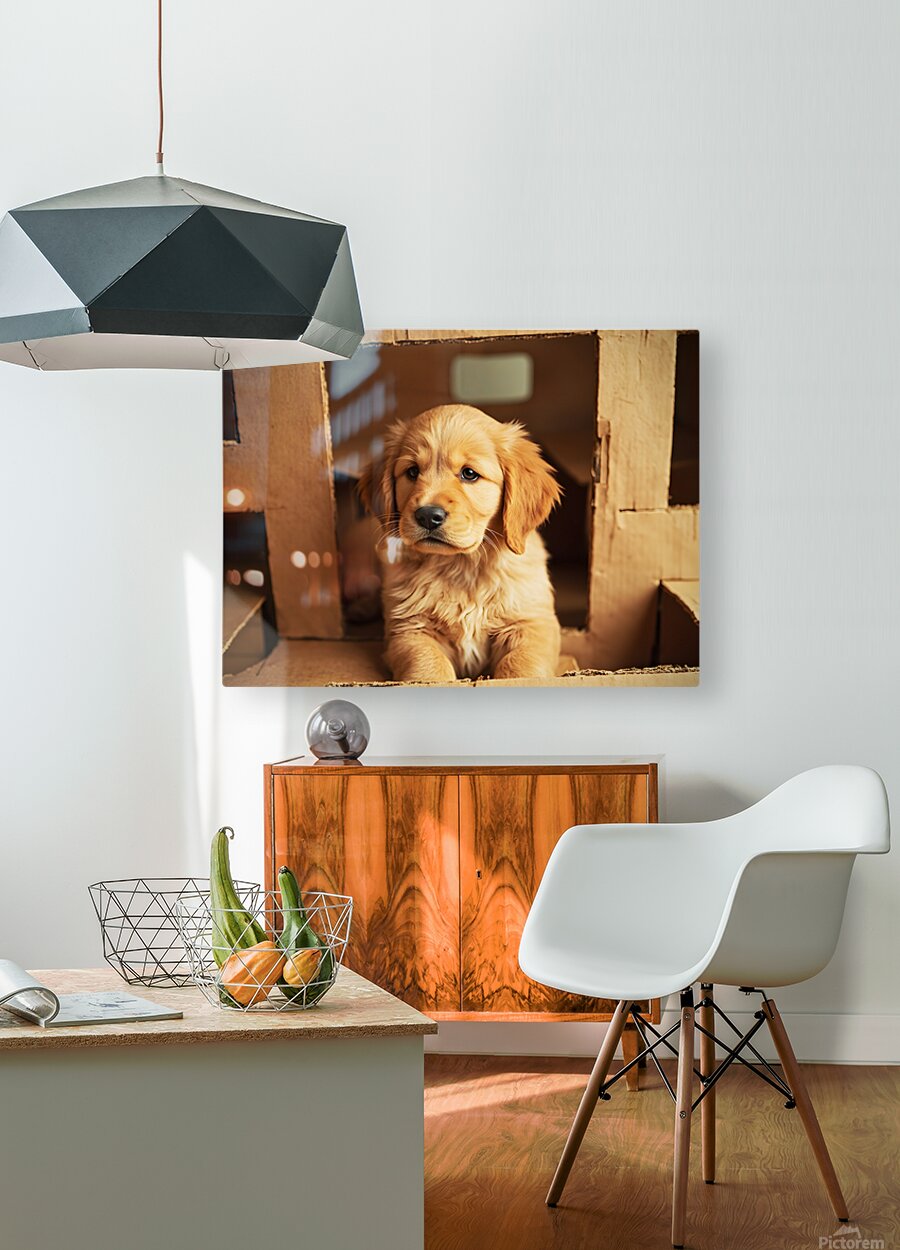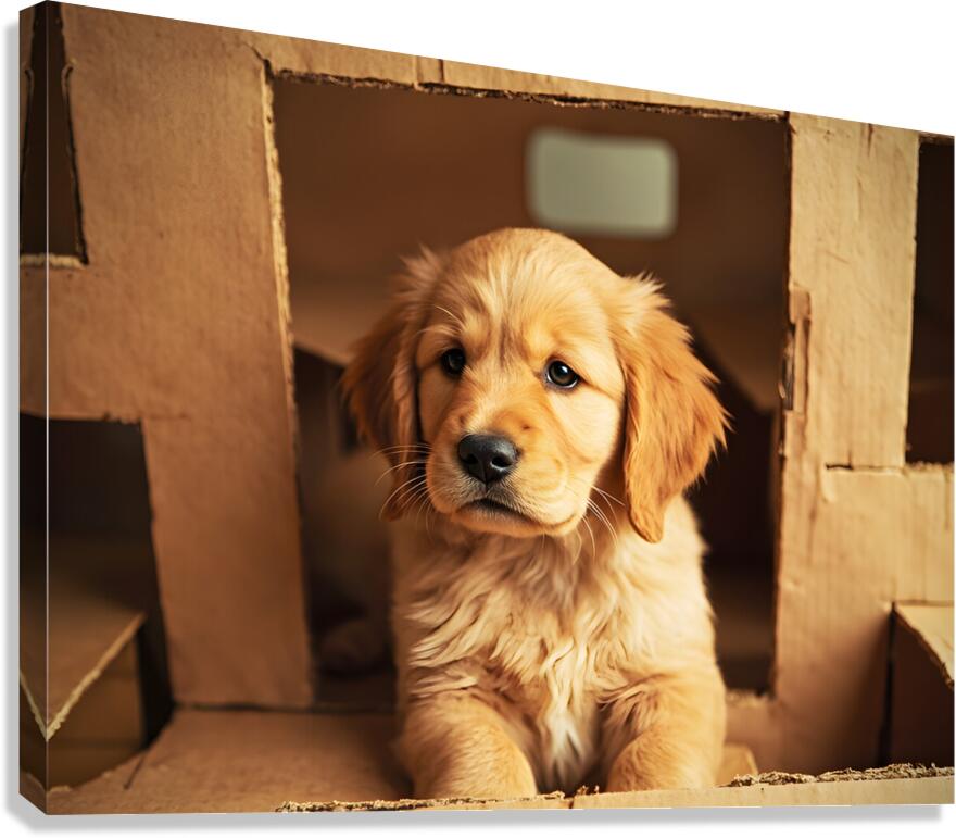 An adorable golden retriever puppy with fluffy golden coat sits inside a brown cardboard box looking alert and playful. The box contains soft materials for comfort creating a cozy den-like atmosphere with gentle indoor lighting. Digital Artwork.