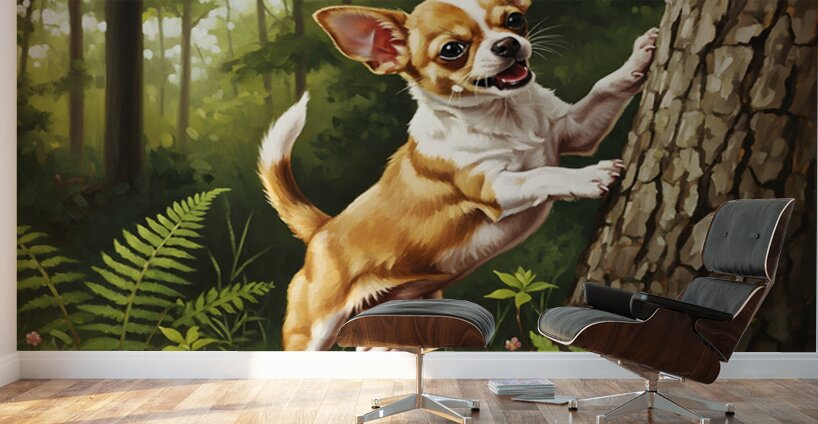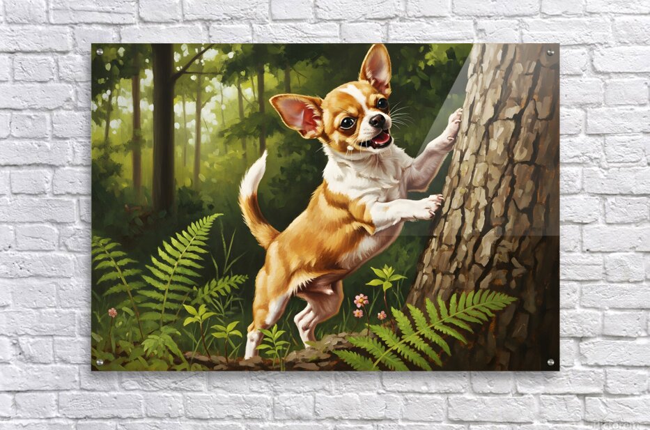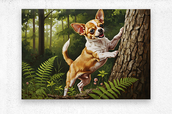 Get this artwork "Chihuahua Puppy Spots Squirrel In Tree" in a framed print.