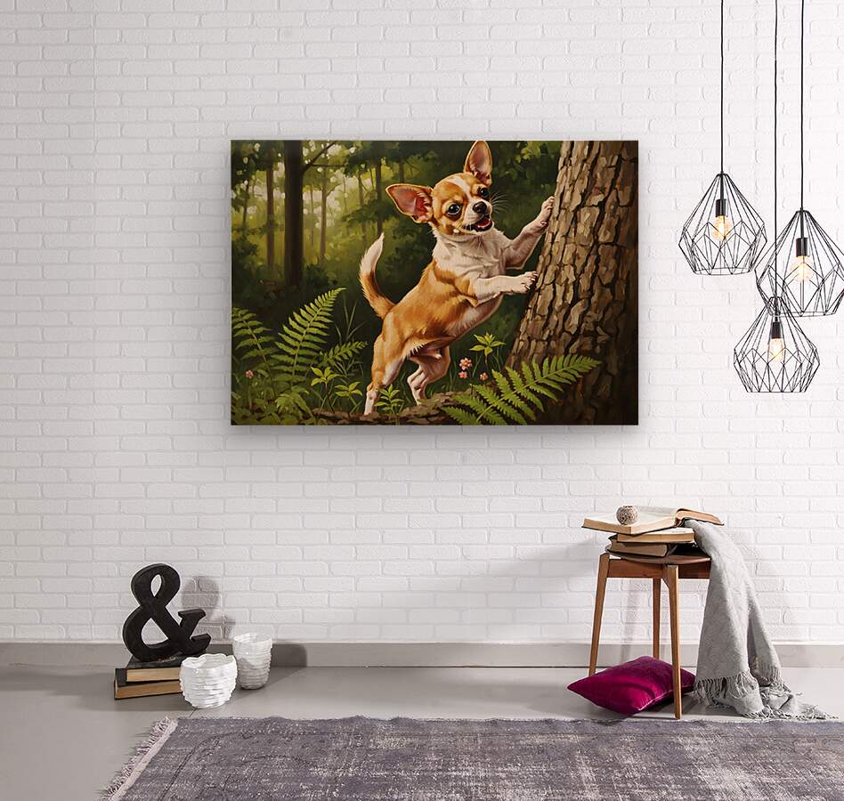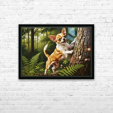 Get this artwork "Chihuahua Puppy Spots Squirrel In Tree" in a framed print.