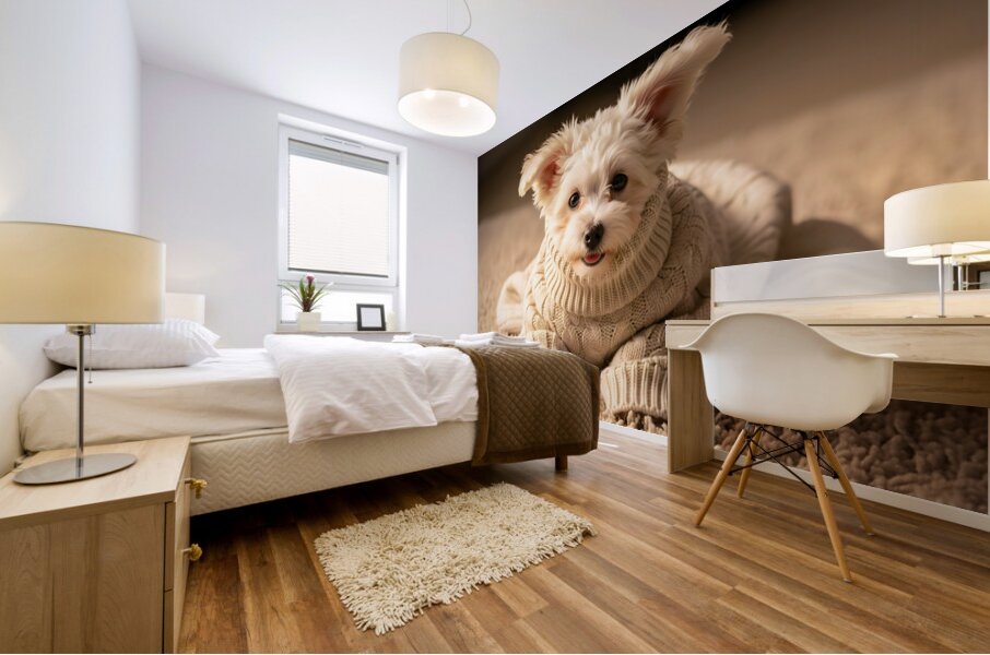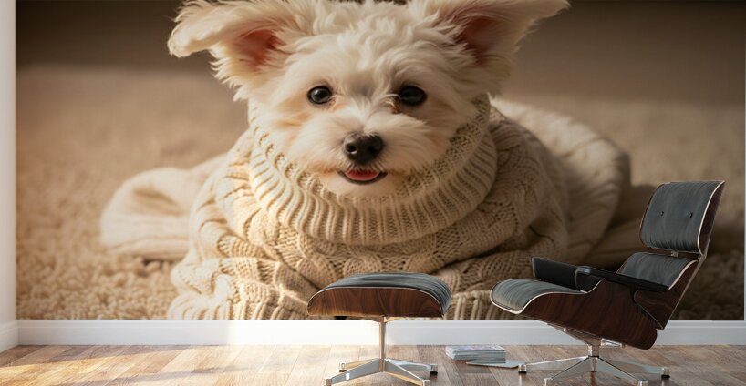 A delighted white Bichon Frise puppy sits proudly wearing a perfectly fitted cream-colored sweater looking accomplished and cozy with its fluffy tail in motion and bright happy eyes Digital Artwork.