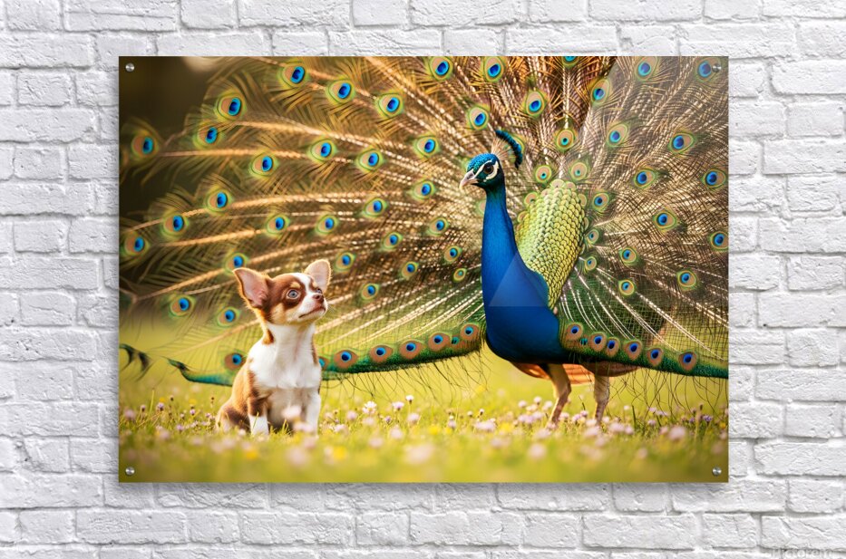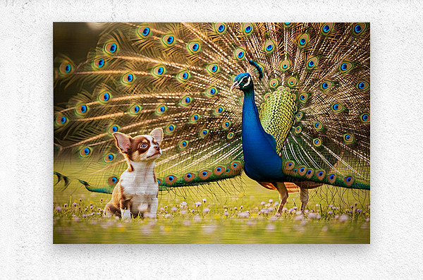A small brown and white Chihuahua puppy puffs out its chest and raises its tail attempting to mirror a peacocks regal stance. The peacock watches with folded feathers appearing entertained by the puppys adorable imitation efforts. Digital Artwork.