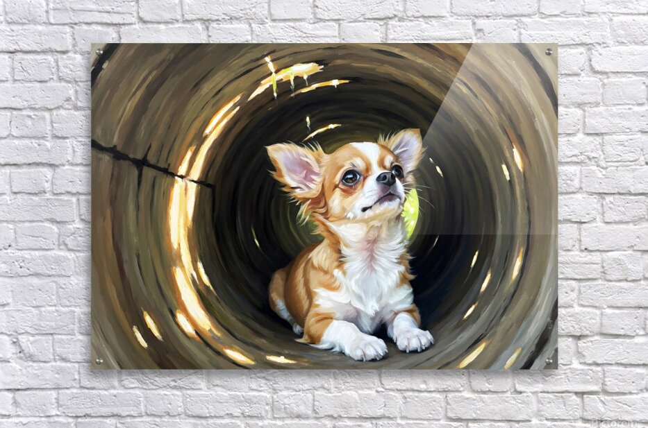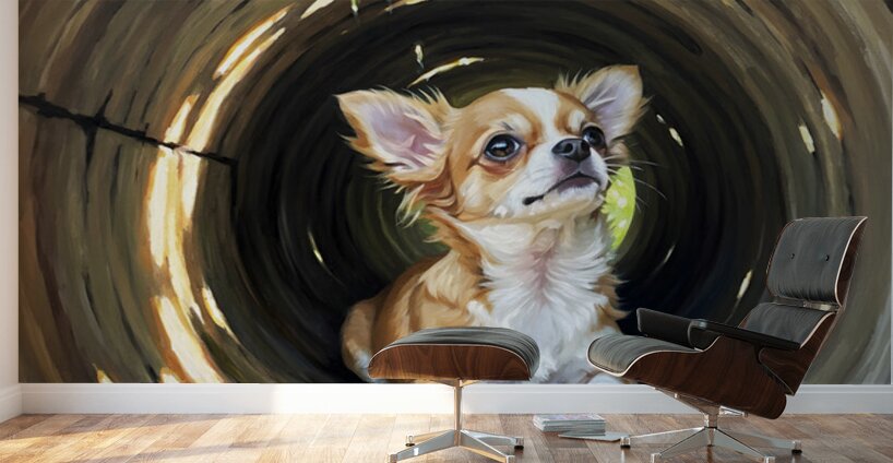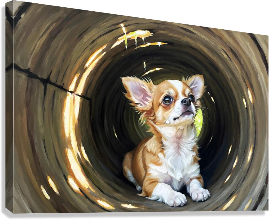 Get this artwork "Happy Chihuahua Puppy Exits Log Adventure" in a framed print.