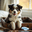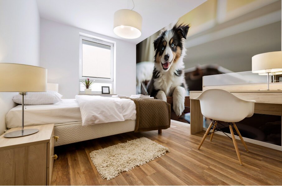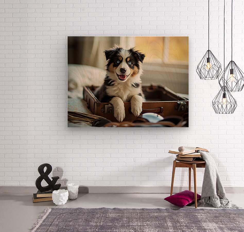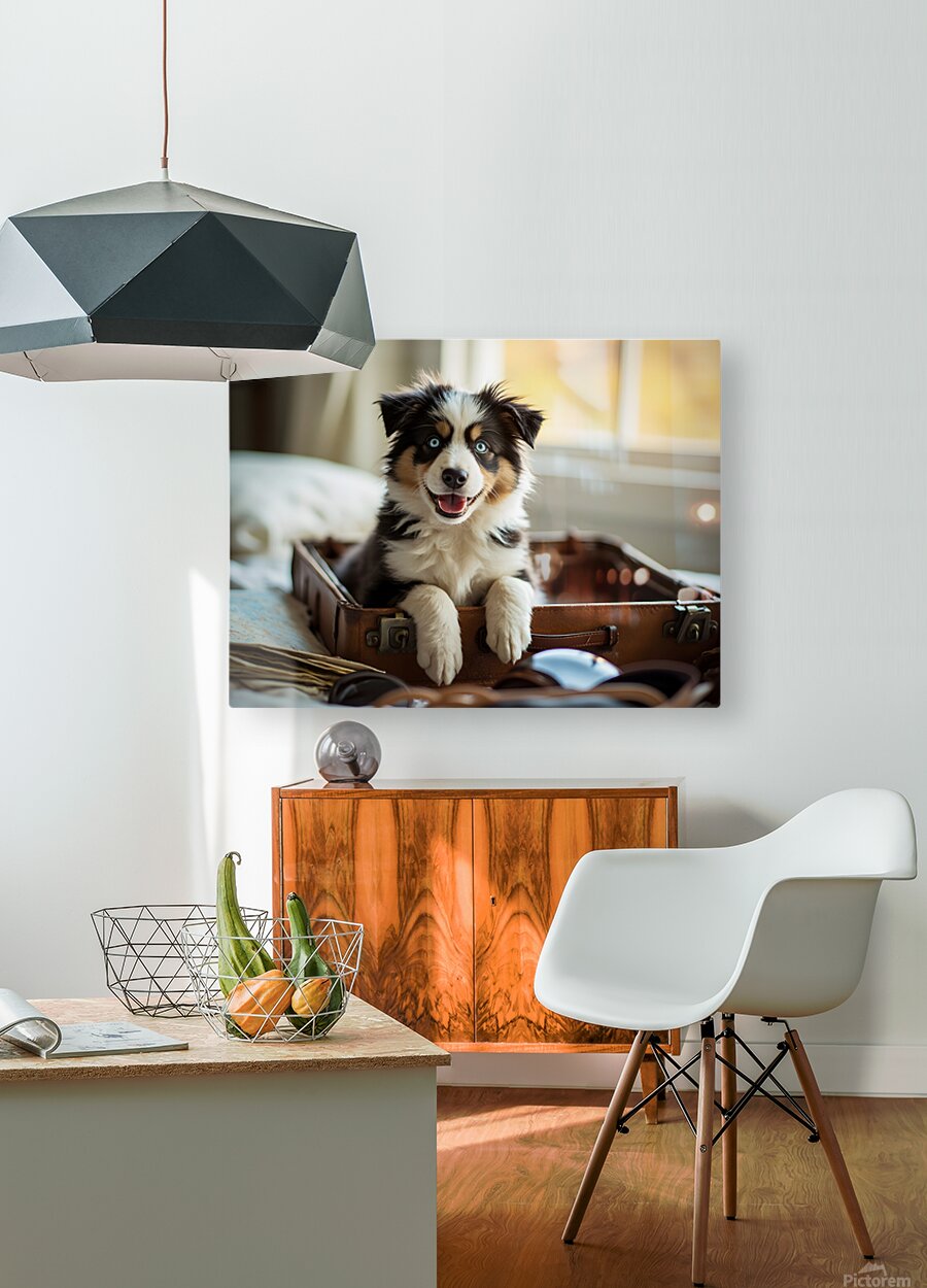 The peaceful blue merle Australian Shepherd puppy has settled back into the suitcase with a content drowsy expression. Its blue eyes are half-closed as it relaxes completely ready for whatever adventure awaits. Digital Artwork.