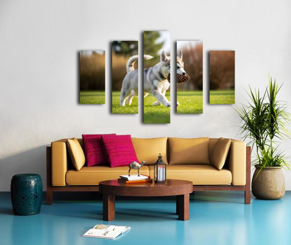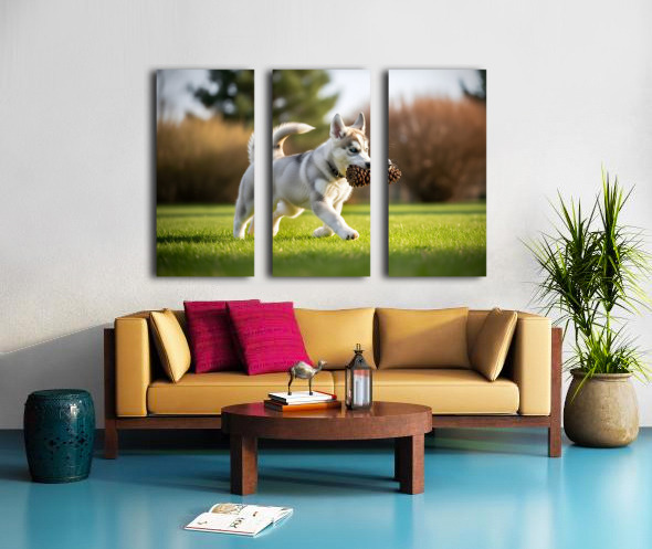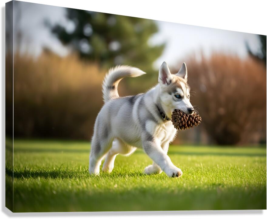 Siberian Husky Puppy Discovers Pinecone In Sunny Garden Canvas print