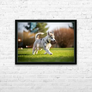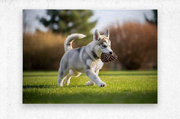 Get this artwork "Siberian Husky Puppy Discovers Pinecone In Sunny Garden" in a framed print.