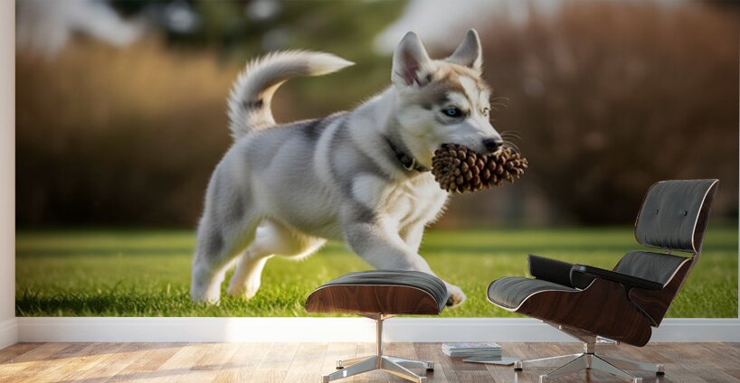 An adorable gray and white Siberian Husky puppy with striking blue eyes stands on green grass gazing curiously at a brown pinecone. The fluffy puppys tail is raised in excitement as colorful wildflowers blur softly in the foreground. Digital Artwork.