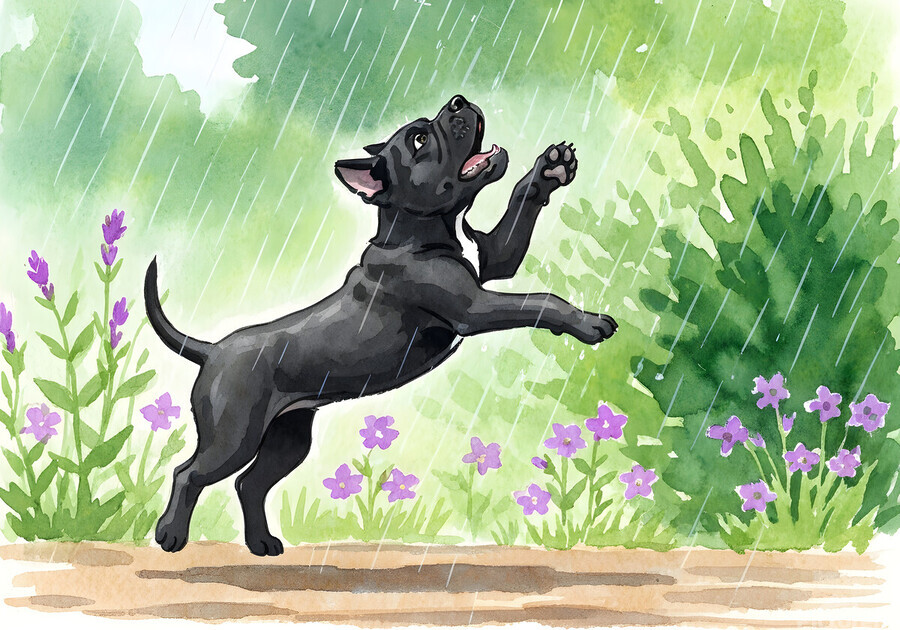 A small black Cane Corso puppy with soft floppy ears stands in a vibrant garden setting gazing upward with an excited expression as the first raindrop...[+]