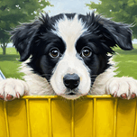 ABOUT THIS ARTWORK: BORDER COLLIE PUPPYS FIRST BICYCLE BASKET ADVENTURE BEGINS