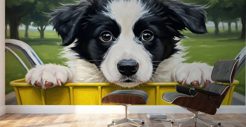 An adorable black and white Border Collie puppy sits eagerly in a wicker bicycle basket fluffy coat gleaming in sunlight. The young pups bright eyes sparkle with excitement as it prepares for its very first ride ears alert and ready for adventure. Digital Artwork.