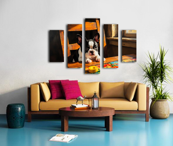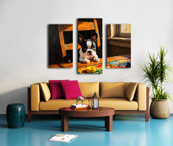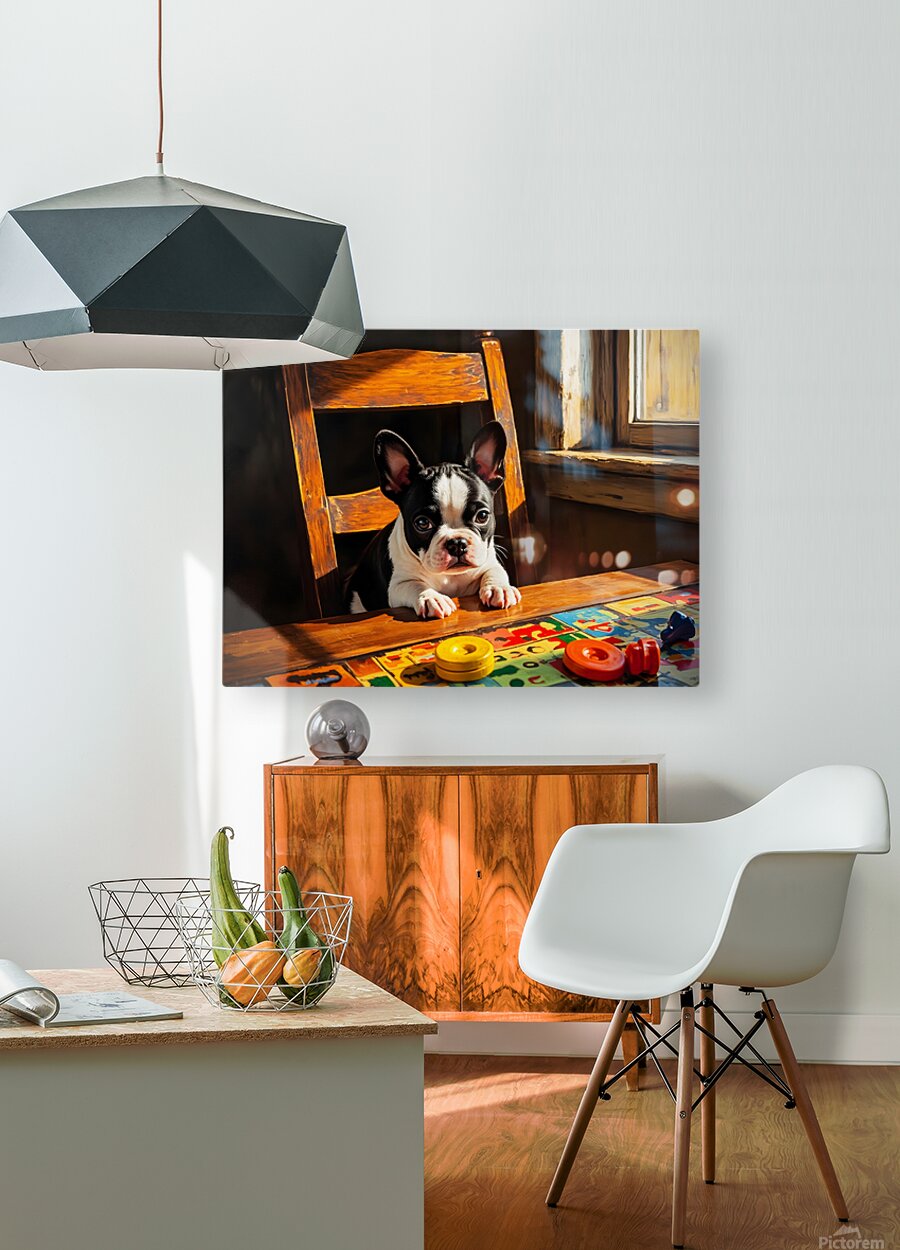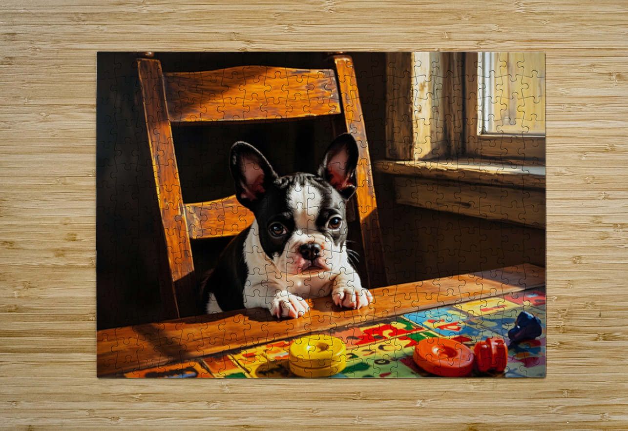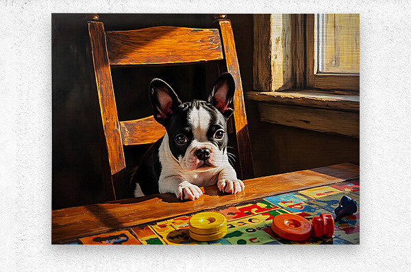 A delighted black and white Boston Terrier puppy sits at the game table with a small colorful game piece carefully held in its mouth looking very proud of participating in the family board game activity. Digital Artwork.