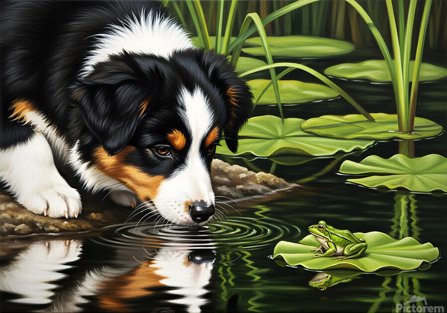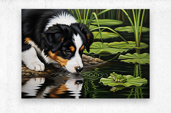Get this artwork "Australian Shepherd Puppy Discovers A Quiet Pond" in a framed print.