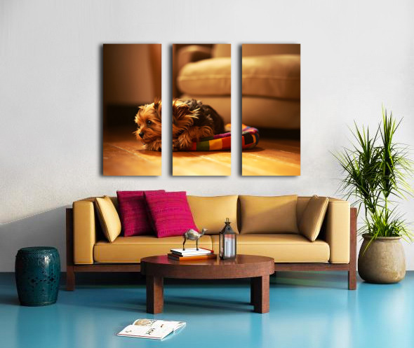 Happy Yorkshire Terrier Puppy Plays With Toy Canvas print