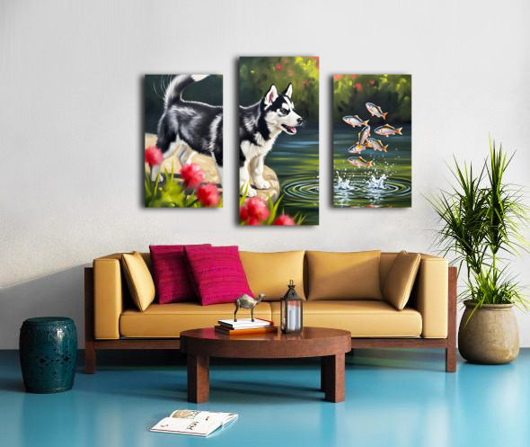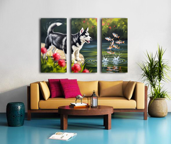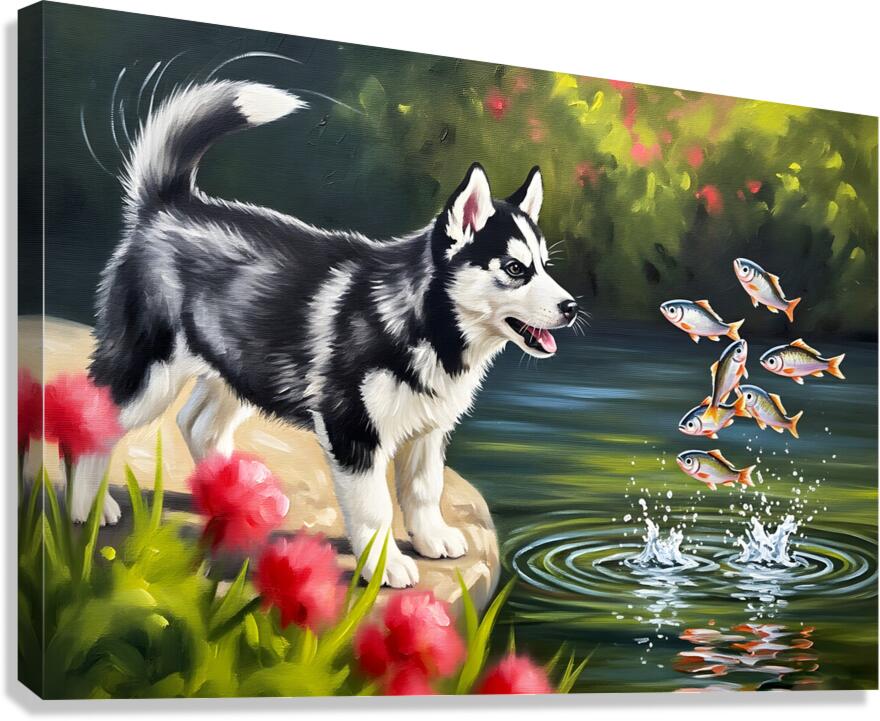 Happy Husky Puppy Enjoys Pond Watching Canvas print