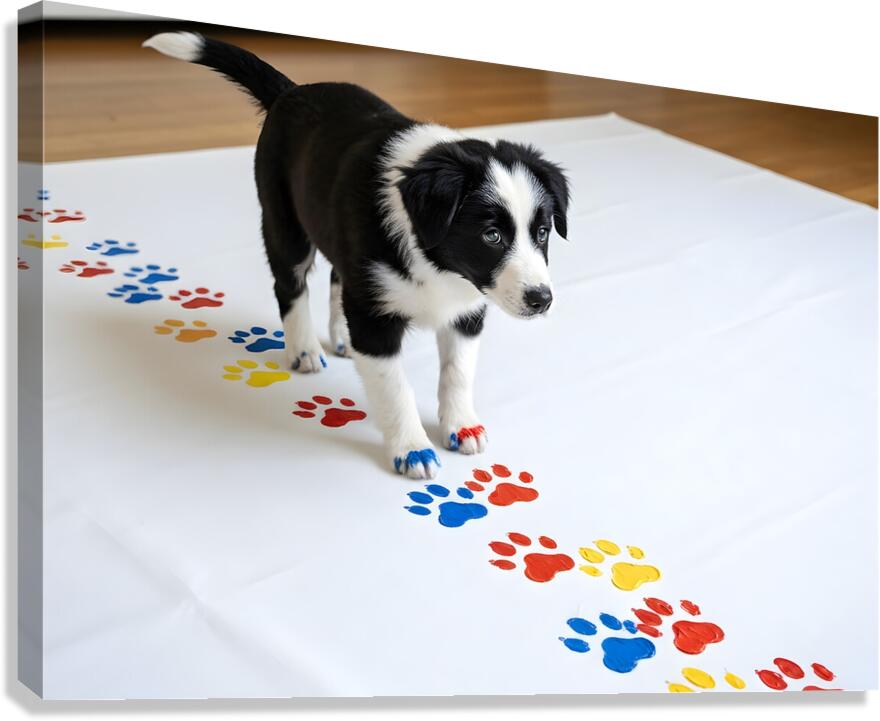 A satisfied Border Collie puppy sits beside its completed paw print artwork on canvas. The young artist has colorful paint on its fur and looks proud ...[+]