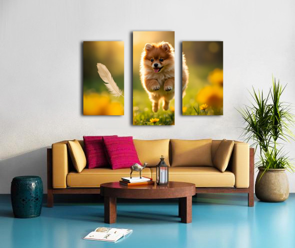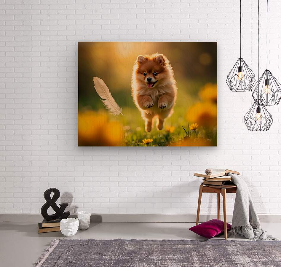Feather Lands On Happy Pomeranian Puppy Canvas print