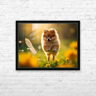 Feather Lands On Happy Pomeranian Puppy Picture Frame Printing