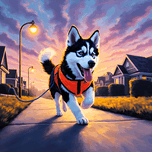 A young Siberian Husky puppy with distinctive black and white markings sits proudly on a wooden porch wearing a bright orange reflective vest. The golden evening light creates a warm glow as the puppy prepares for an evening walk. Digital Artwork.