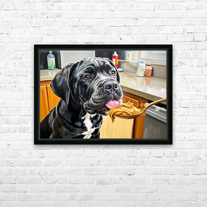 A young black and gray Cane Corso puppy sits alert on a kitchen floor gazing upward with bright curious eyes at a spoon holding golden brown peanut butter. The warm kitchen setting creates an inviting atmosphere for this first culinary adventure. Digital Artwork.
