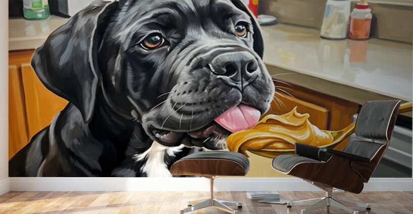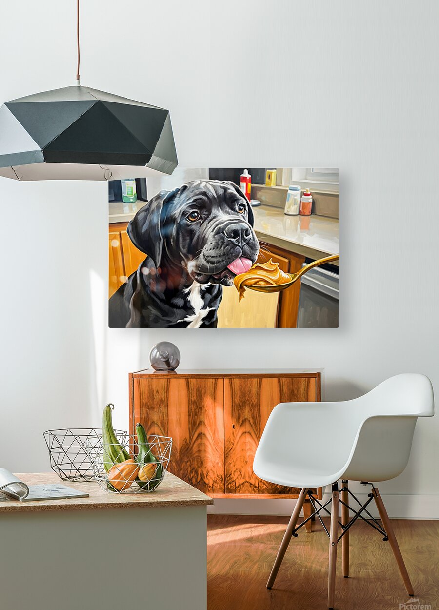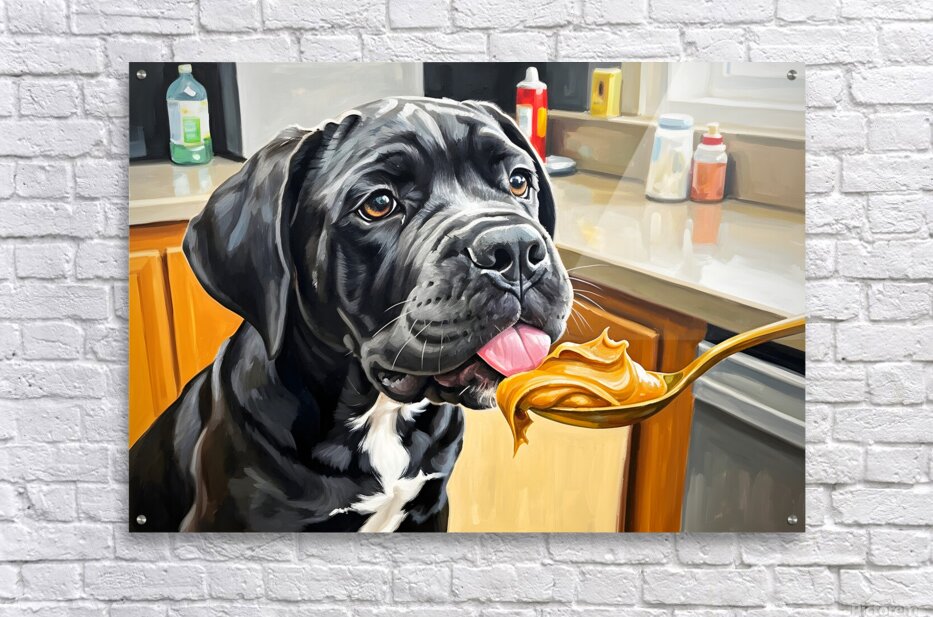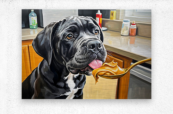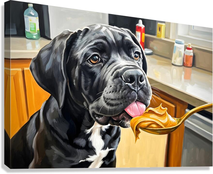 A young black and gray Cane Corso puppy sits alert on a kitchen floor gazing upward with bright curious eyes at a spoon holding golden brown peanut butter. The warm kitchen setting creates an inviting atmosphere for this first culinary adventure. Digital Artwork.