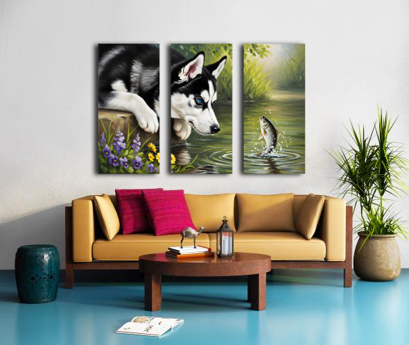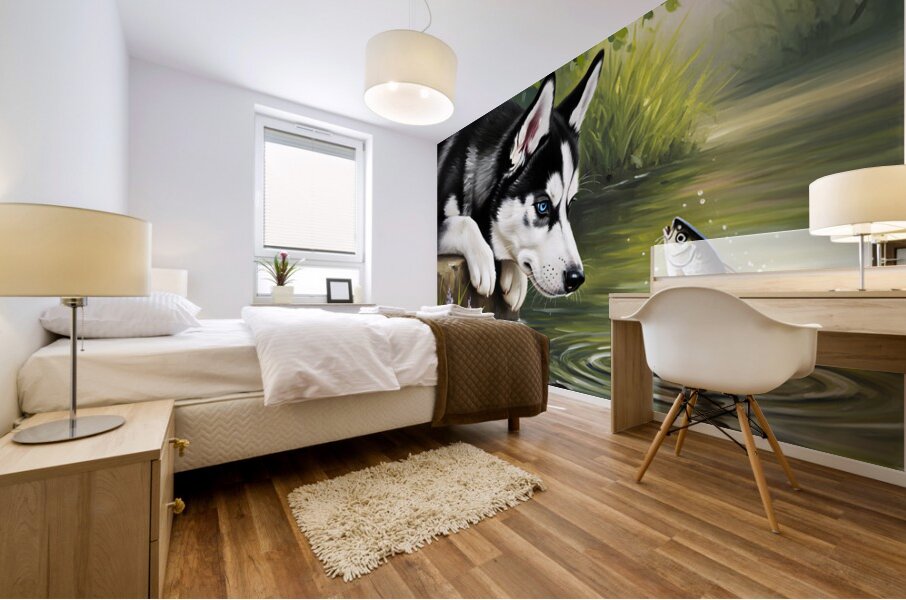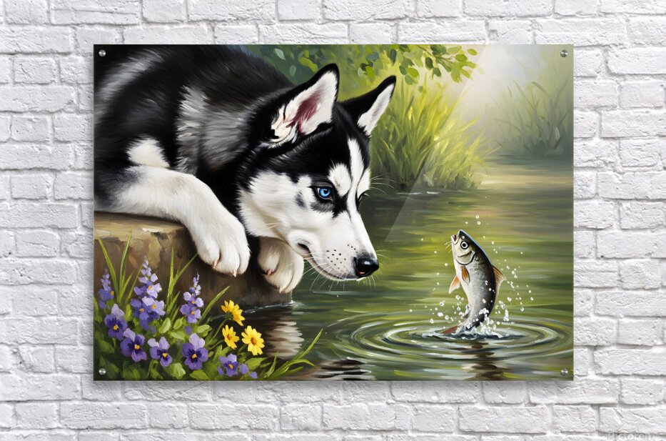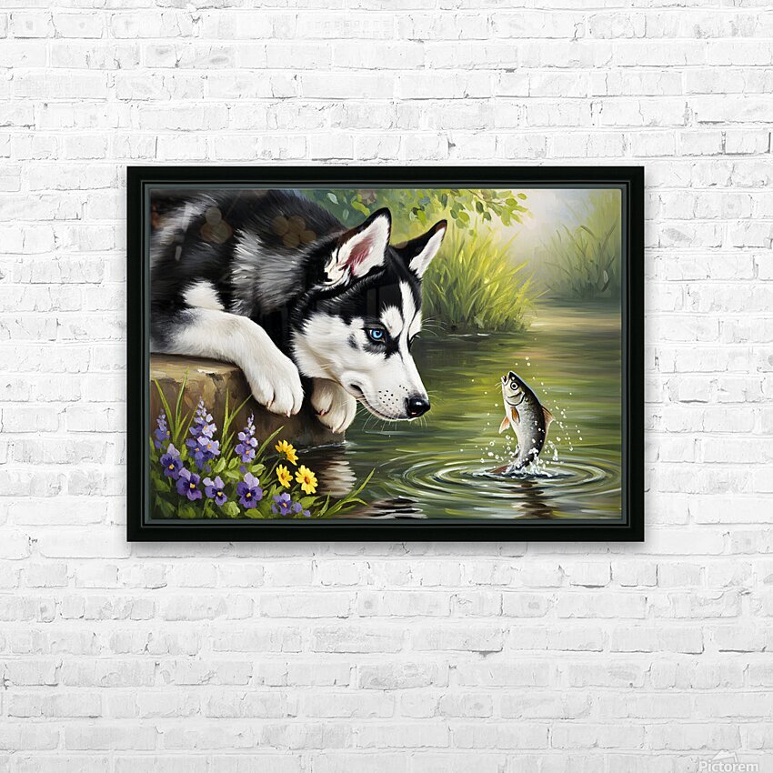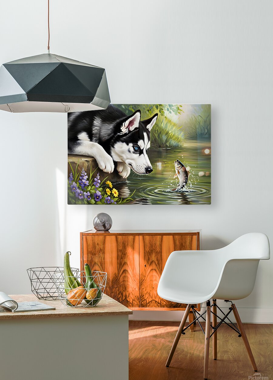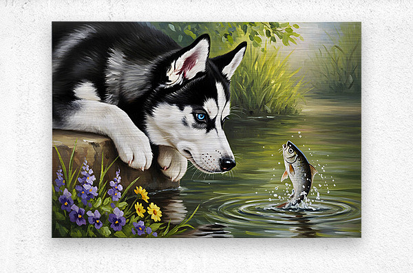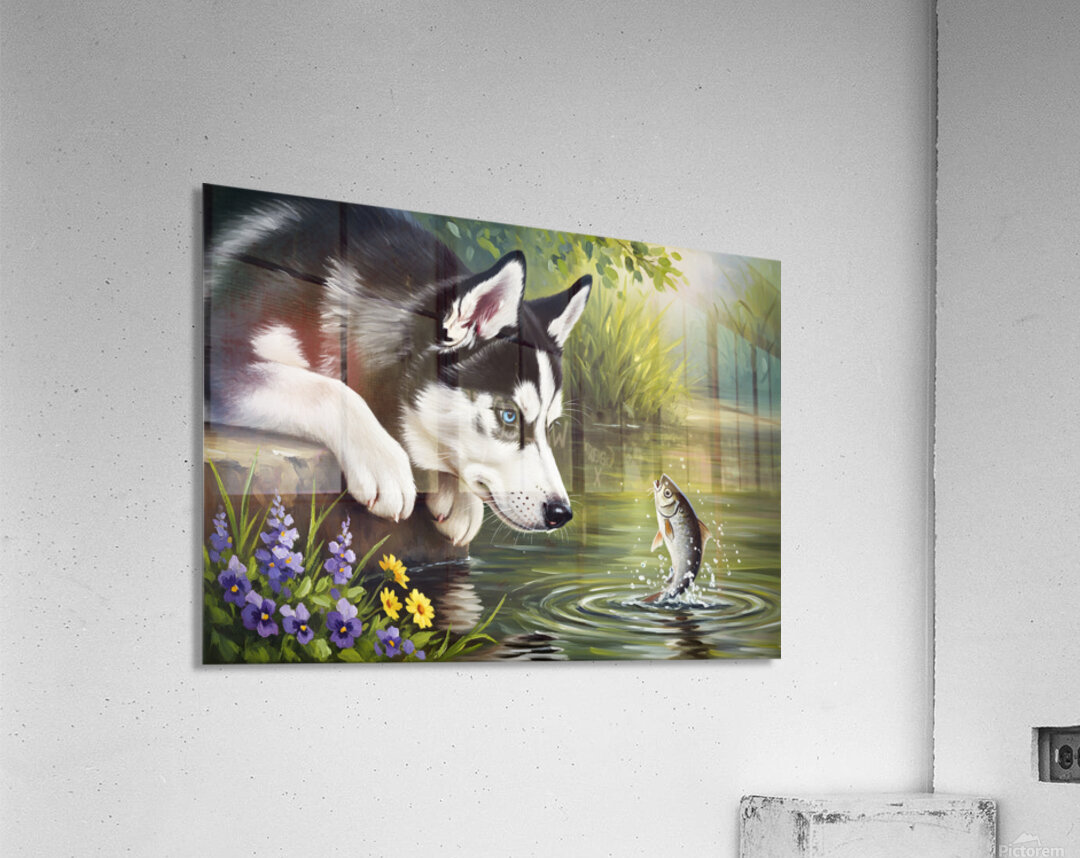 ABOUT THIS ARTWORK: CURIOUS HUSKY PUPPY DISCOVERS GARDEN POND