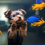 A tiny Yorkshire Terrier puppy with distinctive tan and black markings sits motionless on polished wooden flooring completely captivated by a magnificent glass aquarium. The clear tank holds vibrant tropical fish that glide through pristine water. Digital Artwork.
