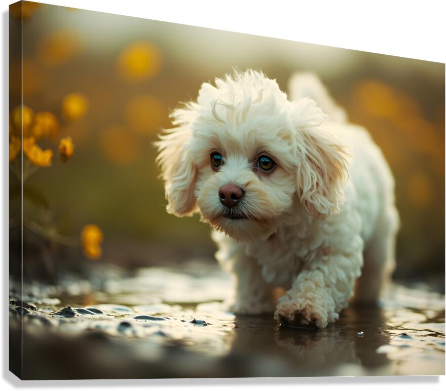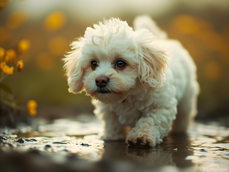 A content white poodle puppy sits proudly with her tail up having solved the mystery of her reflection. Her curly fur appears bright and clean with her cheerful expression showing satisfaction framed by colorful wildflowers. Digital Artwork.